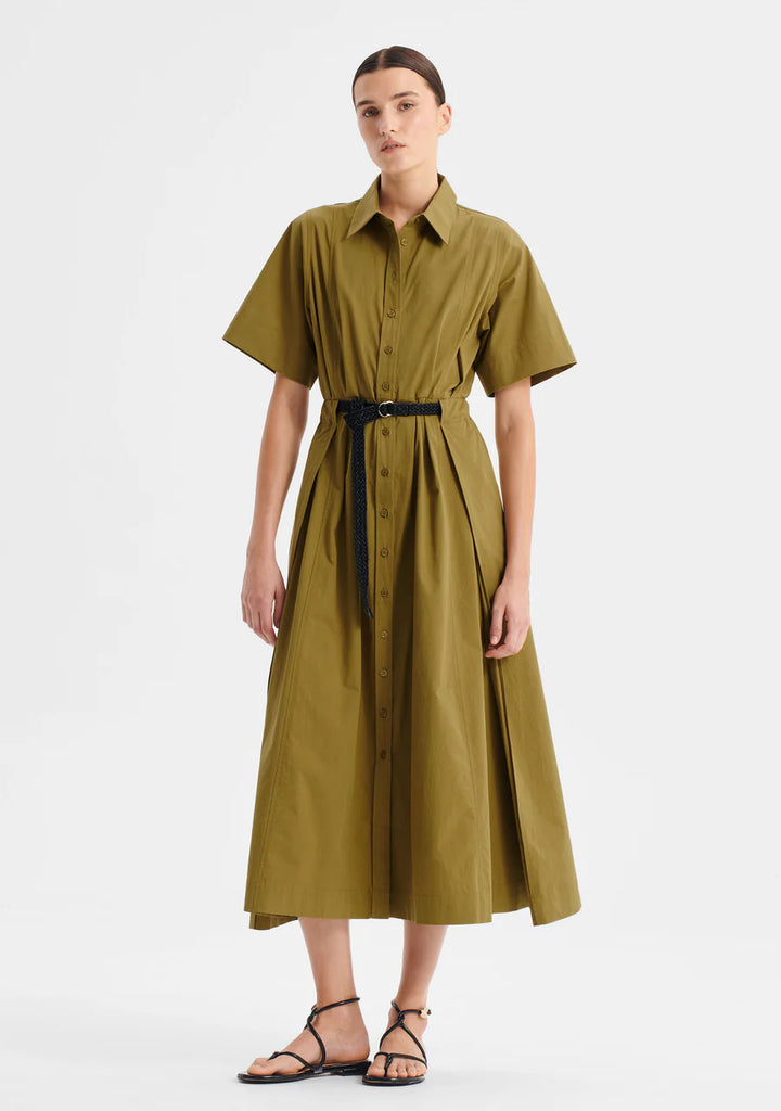 Crafted in cotton twill, the Ingrid Shirt Dress combines structure with ease. A traditional collar, button front, and tailored bodice create polish, while short sleeves and tunnel waist detailing add interest. Finished with an A-line midi skirt and contrast belt, it’s a versatile piece for everyday or occasion wear.