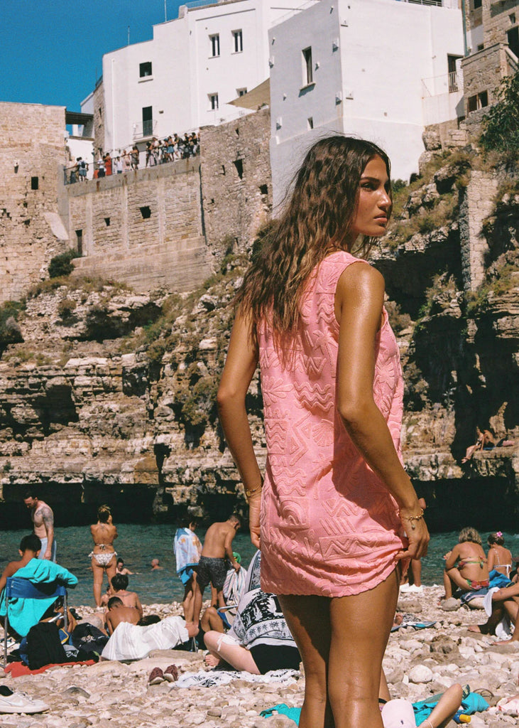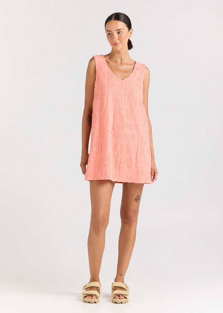 The Mai Tai Dress is back this season in a vibrant coral tone made for summer. Crafted from soft, textured terry with our signature jacquard pattern, this best-selling silhouette features a relaxed fit, V-neckline, and mini length that make it the perfect throw-on for poolside or resort days. Lightweight, playful, and effortlessly flattering, it’s your go-to piece for sunshine moments and endless summer styling.