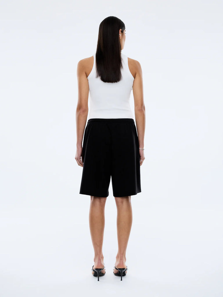 The Sarah Track Short in Vintage Black features a relaxed elastic waist and is constructed from buttery soft modal fabric. It is mid rise, Bermuda short length, finished with side contrast piping detail.
