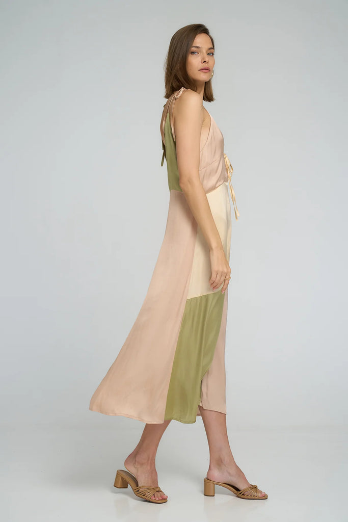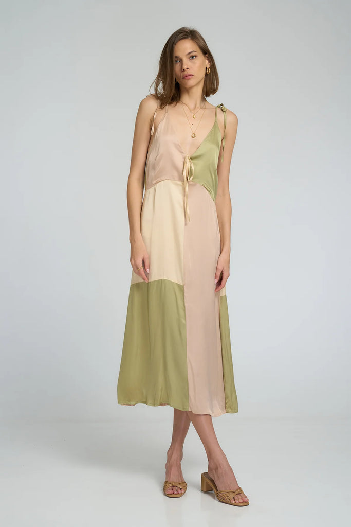 Soft, feminine, and effortlessly flattering — the Peony Dress is your new fashion statement piece for spring. Crafted in a lightweight shiny viscose, this pastel midi dress features a patchwork blend of soft shell pink, butter yellow, and sage green tones. The adjustable tie front and shoulder straps let you customise the fit, making it as comfy as it is pretty. Perfect for brunch, beach holidays, or relaxed events, this beautiful dress moves with ease from day to night.