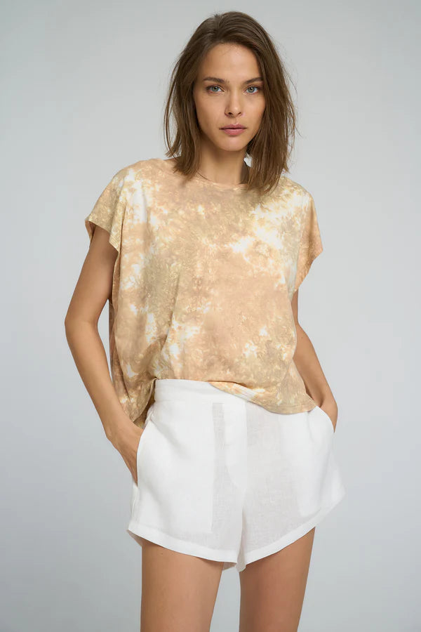The Pura Vida Tee in Earth Tie Dye is a cotton jersey cropped tee featuring a round neckline and cap sleeves. Designed with a relaxed boxy fit, this versatile tee comes in both vibrant tie dye and classic white, perfect for casual, everyday wear.