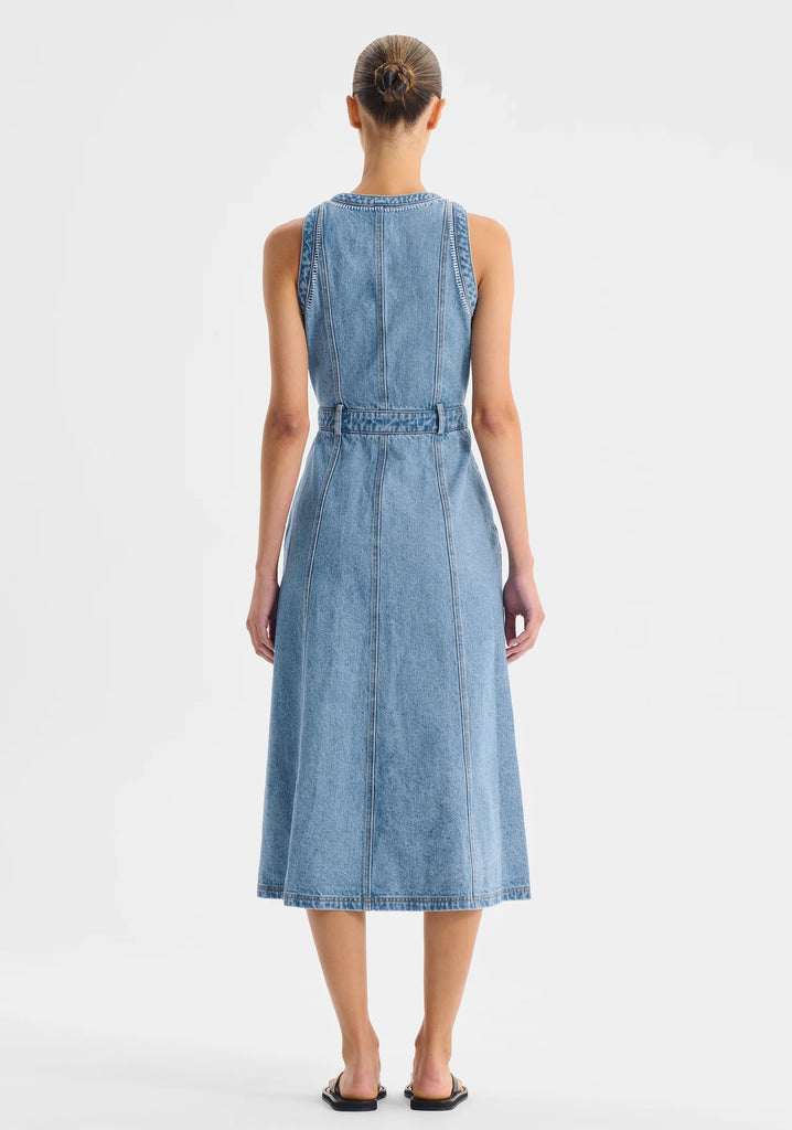 Crafted from mid-weight cotton denim, the Hendrix Dress features a V-neckline, sleeveless bodice, and button-front design. Embroidery detailing adds texture, while a fitted waist and A-line midi skirt with slant pockets create a flattering silhouette.
