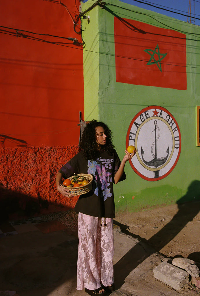 Cut in a wide-leg shape, the pant sits comfortably at the waist and falls loosely through the leg, creating fluid movement with every step.