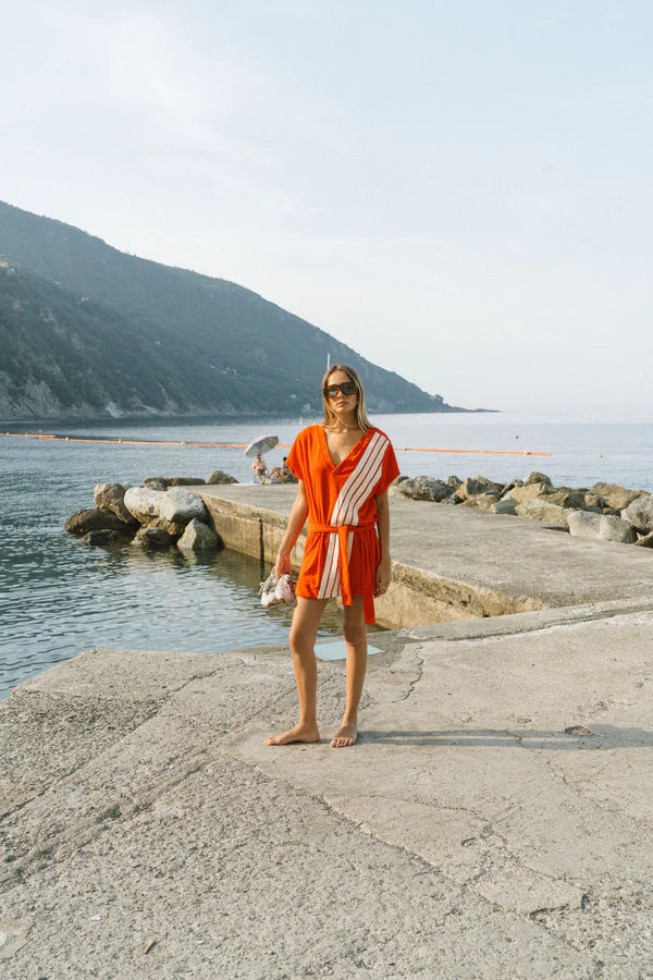 Step into Summer in the Tropiques Terry Dress in Apple Red. Crafted from 100% premium cotton terry towelling, this relaxed mini dress is effortlessly wearable and irresistibly soft. Designed with retro contrast stripes across the front, and tie belt, it’s made to stand out. A curved hemline, side splits and deep v-neckline ensures a flattering fit. Pair with your favourite sneakers or slides, and layer over swim for your next seaside escape.