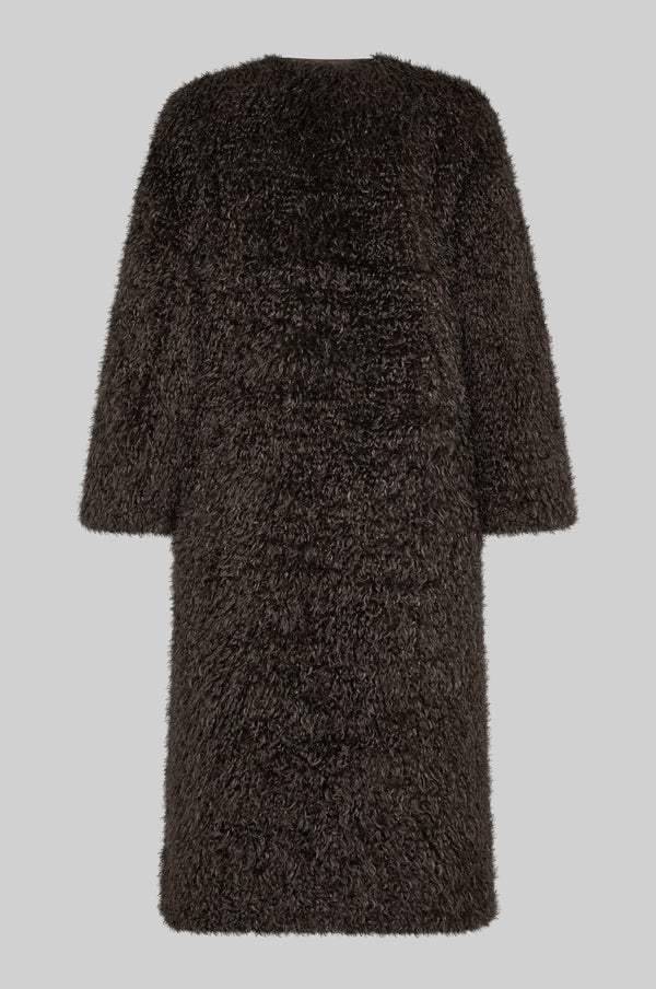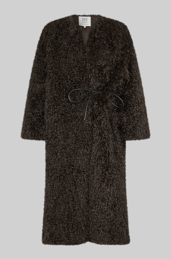 Second Female shaggy coat. The jacket is made in an ultra-soft fabric with shaggy, sheep-like texture. Featuring a tie fastening at one side and two concealed pockets. Fully lined. Loose fit with relaxed, slightly boxy silhouette.